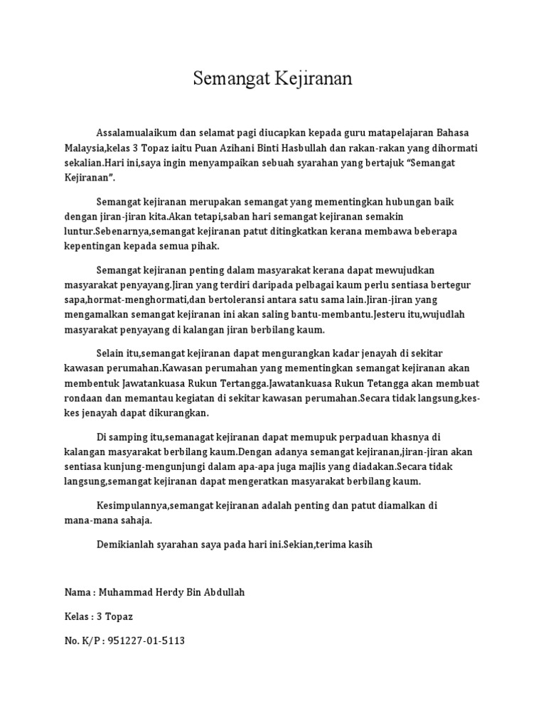 Sebagai kesimpulannya masyarakat akan mendapat banyak faedah jika mengamalkan semangat kejiranan. Contoh Karangan Isu Semasa Srasmi. Semangat kejiranan merupakan salah satu elemen penting dan vital yang membantu melahirkan anggota masyarakat yang harmoni mempunyai jati diri dan semangat cinta akan negara.